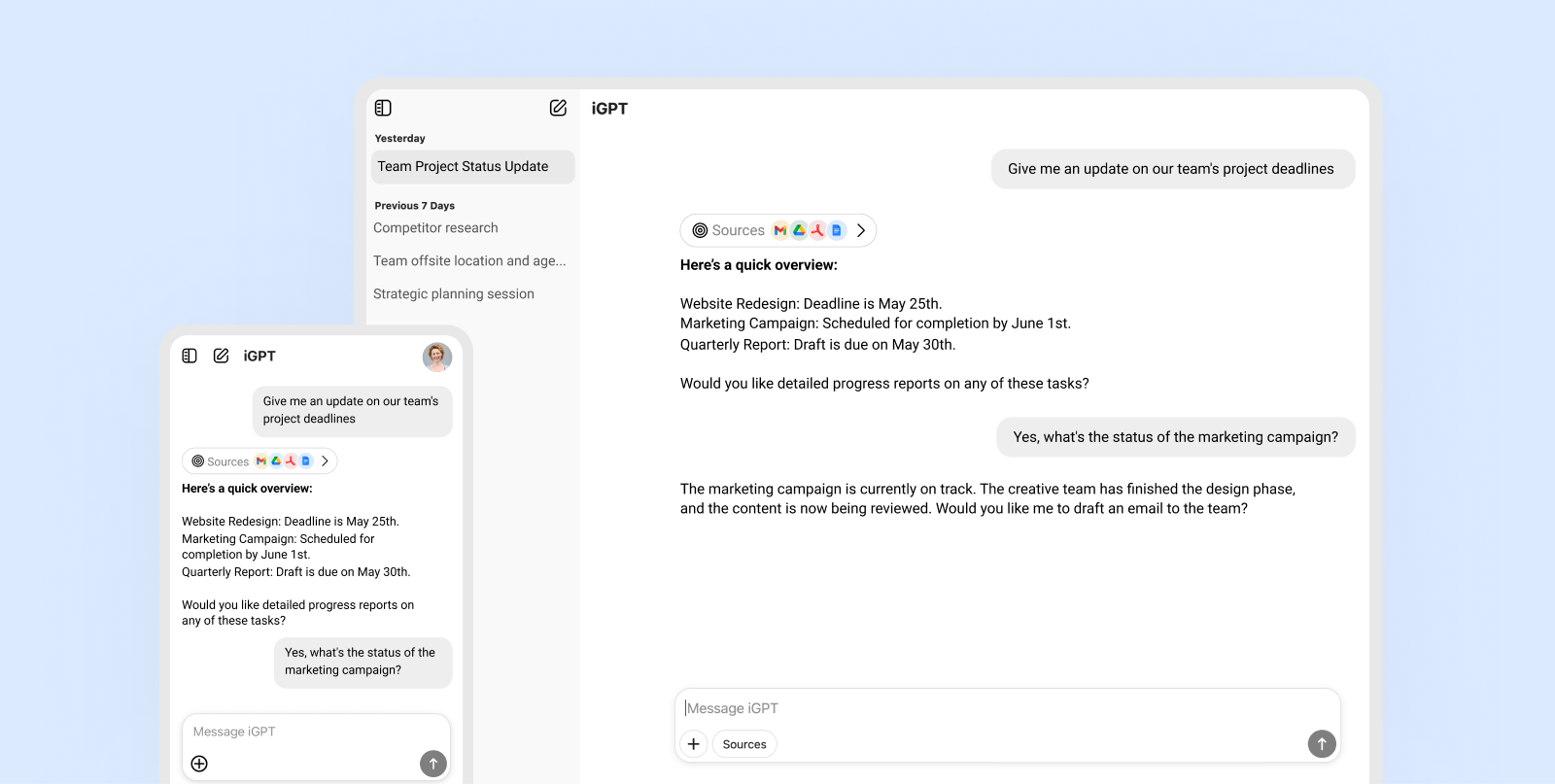 Track progress, blockers, and decisions directly from team conversations. iGPT structures the reasoning across threads so your agents and dashboards stay in sync with real discussions.