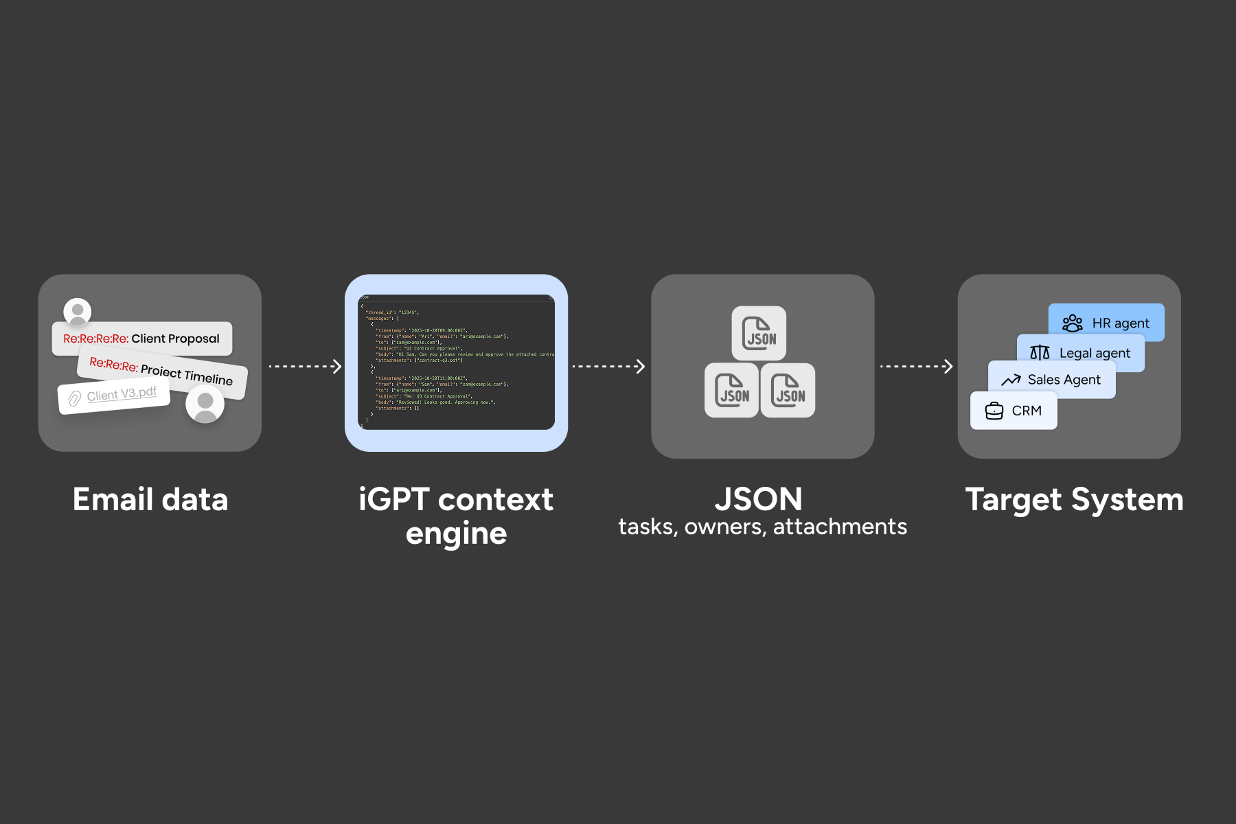 Let your workflows act instantly: iGPT detects intent and decisions in live email, triggering follow-ups, updates, and tasks without manual sorting.